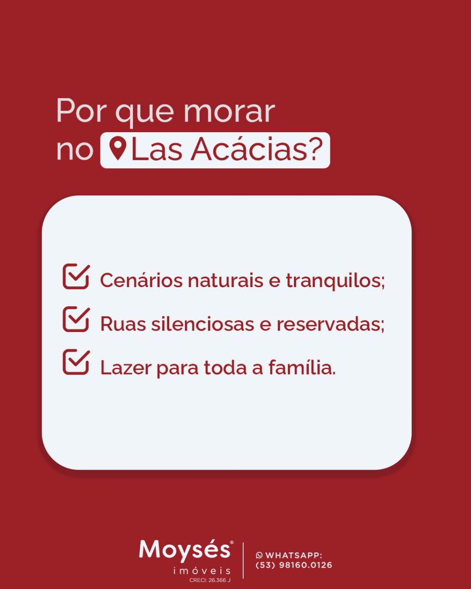A Moysés Imóveis possui um trabalho focado também nessa região, então se você busca, tem um imóvel para colocar à venda ou deseja residir no Las Acácias, fale conosco no WhatsApp 53 8160-0126.