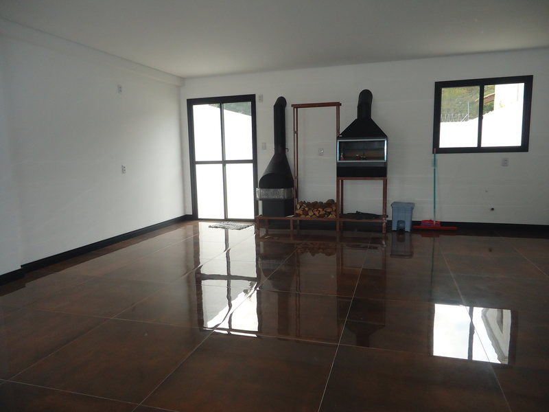 Dividido em dois pavimentos, a parte térrea da casa oferece um amplo living integrado, dispondo de estrutura moderna com um toque do estilo industrial em seus detalhes, entre sala de estar com lareira, sala de jantar e cozinha gourmet com churrasqueira; O térreo também possui banheiro social com espera para torneira e chuveiro; Todo o ambiente social localizado neste primeiro pavimento dispõe de uma estrutura moderna com um toque do estilo industrial em seus detalhes, piso porcelanato esmaltado classe A por toda sua extensão, lareira e churrasqueira com suporte duplo em aço e expositor de lenhas, além de muito iluminação natural por conta de suas amplas janelas e portas de correr.