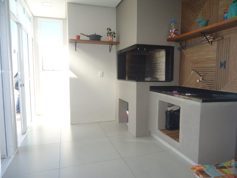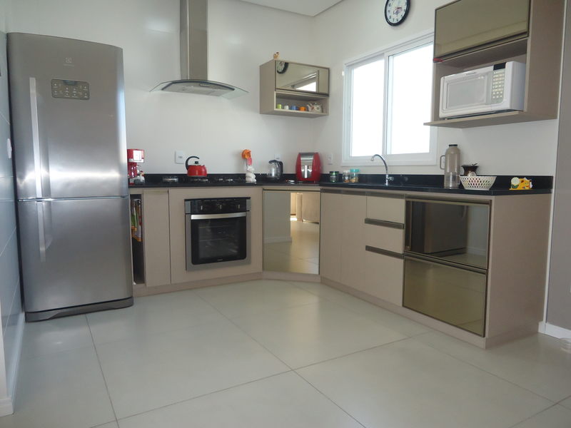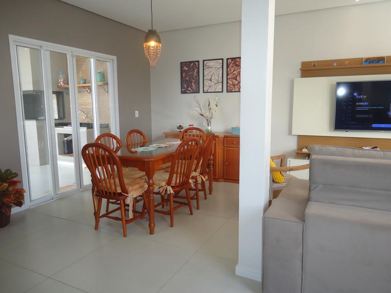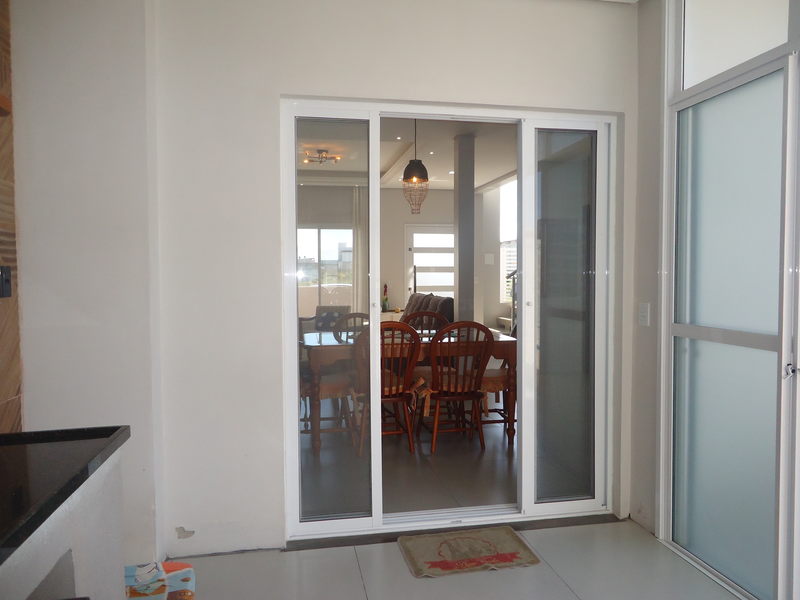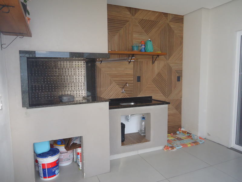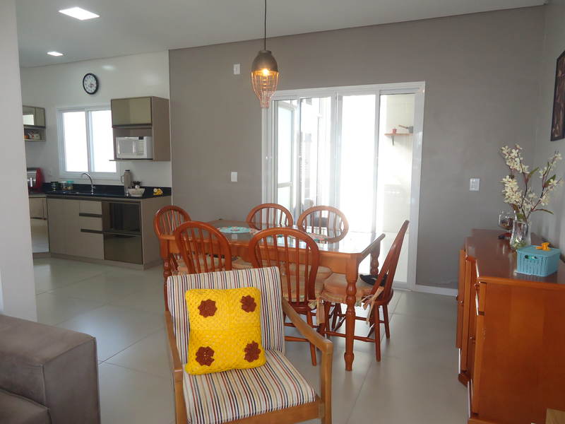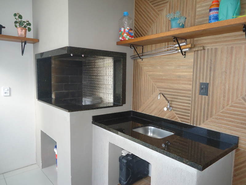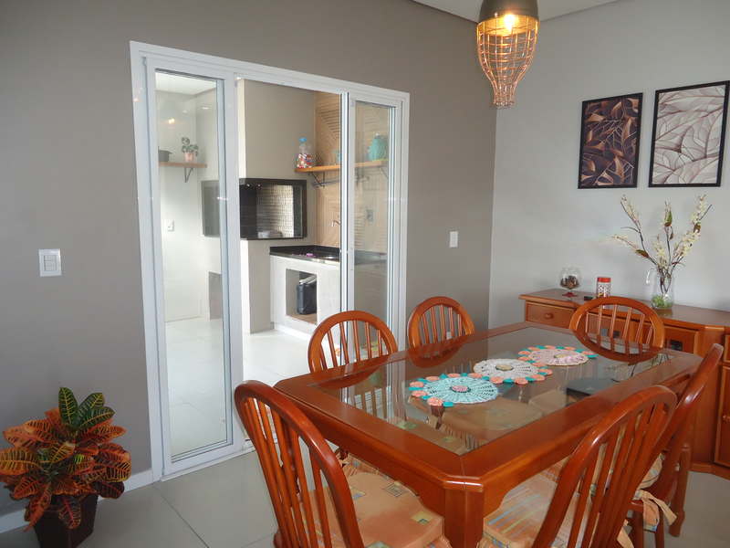Pelo espaço de jantar acessamos uma maravilhosa área gourmet completa com churrasqueira e espaço para cozinha de apoio, perfeito para momentos de descontração, além disso, o espaço é totalmente fechado por amplas portas de correr sendo possível utilizar o ambiente em todas as estações do ano; Estas portas do espaço gourmet se abrem para o pátio da residência, o local possui calçamento por toda sua extensão e oferece uma refrescante piscina para momentos de lazer.