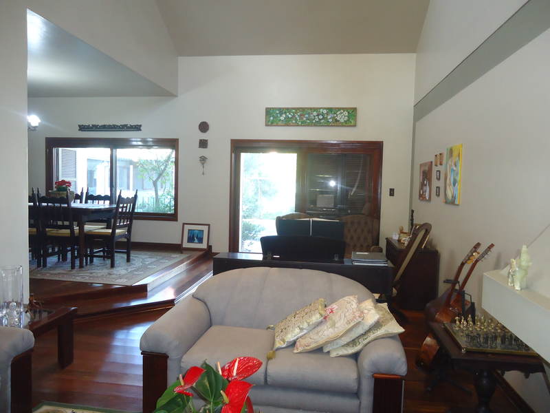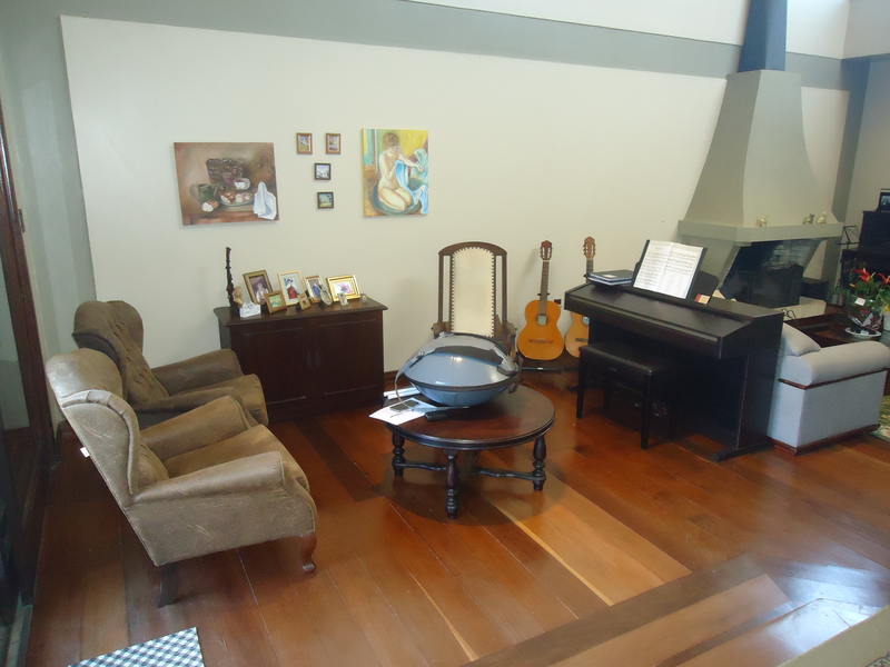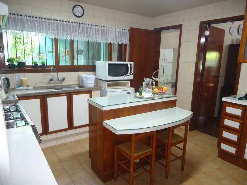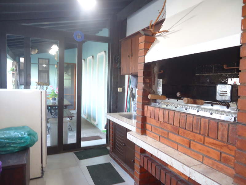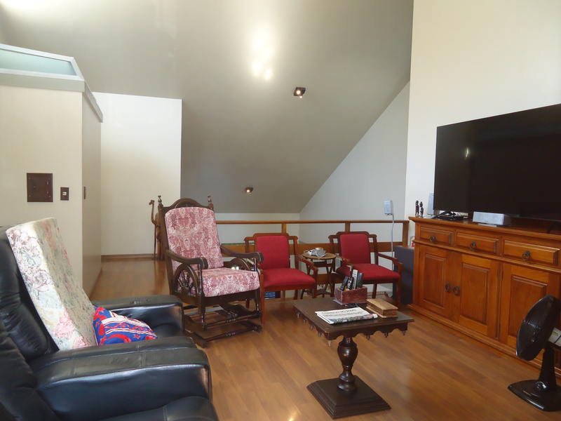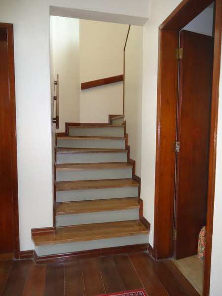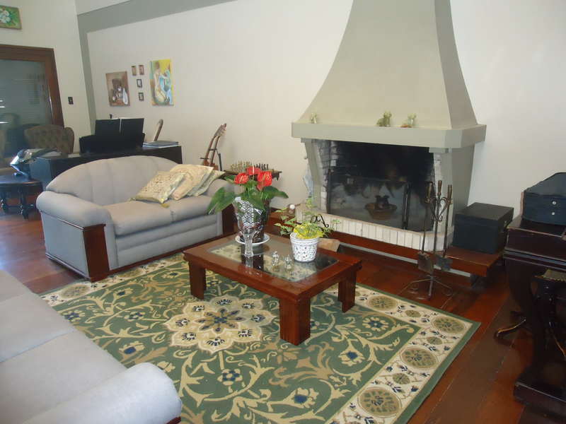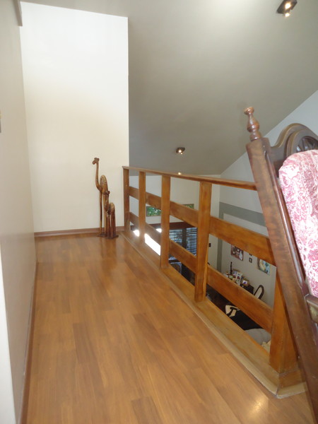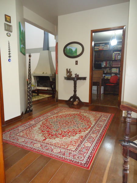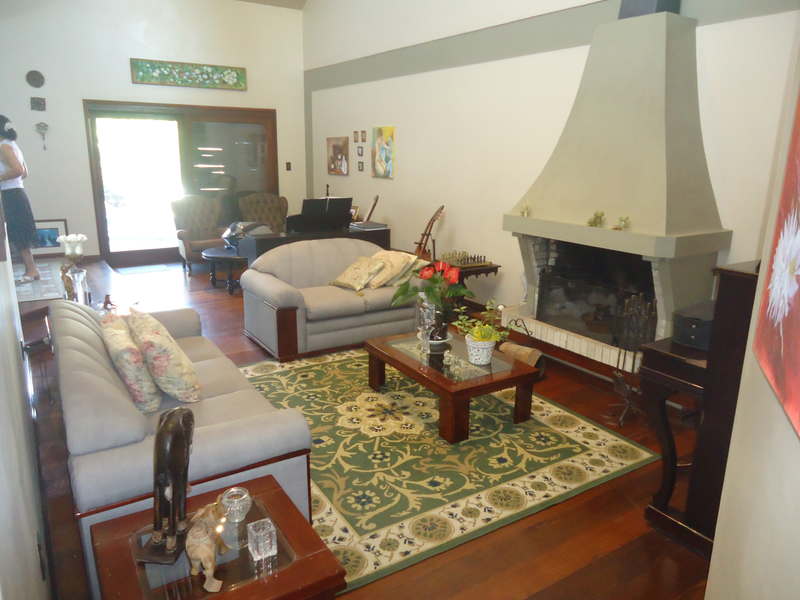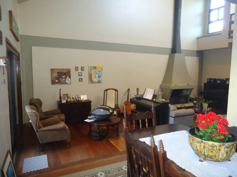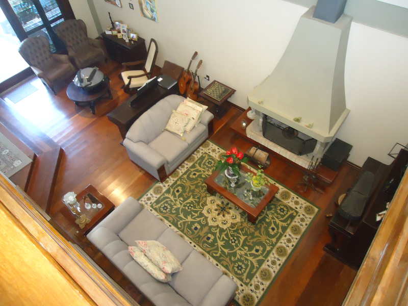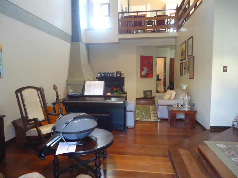 Primeiro piso: Escritório (opção para 4º dormitório), lavabo, sala 2 ambientes com lareira rústica, sala de jantar, sala íntima no andar superior, varanda, copa/cozinha, espaço gourmet com churrasqueira, área de serviço, dependência completa, despensa, pátio com piscina, 2 vagas na garagem.
