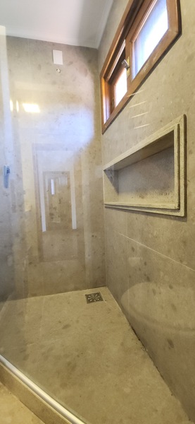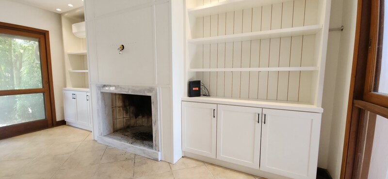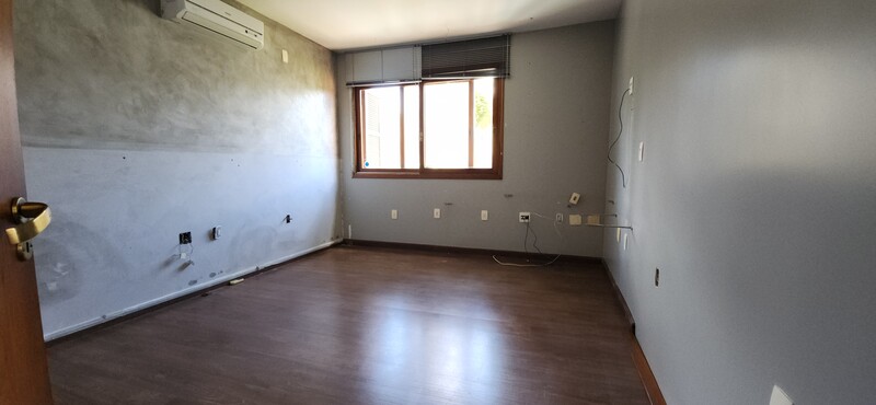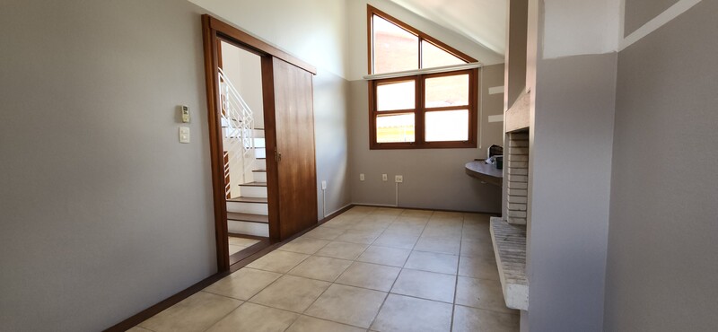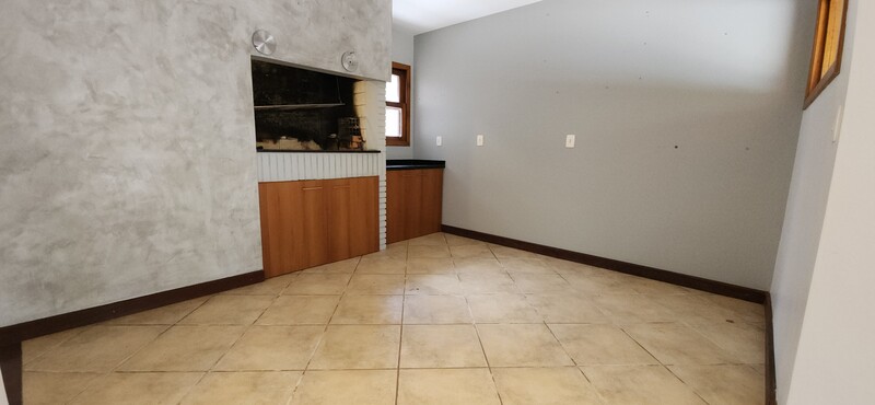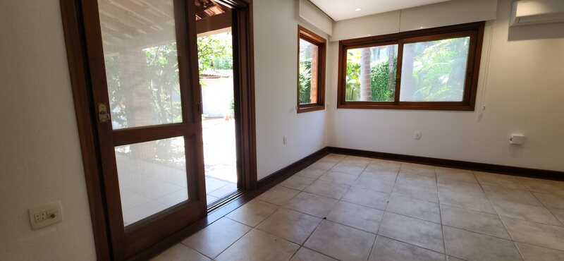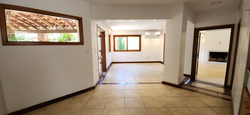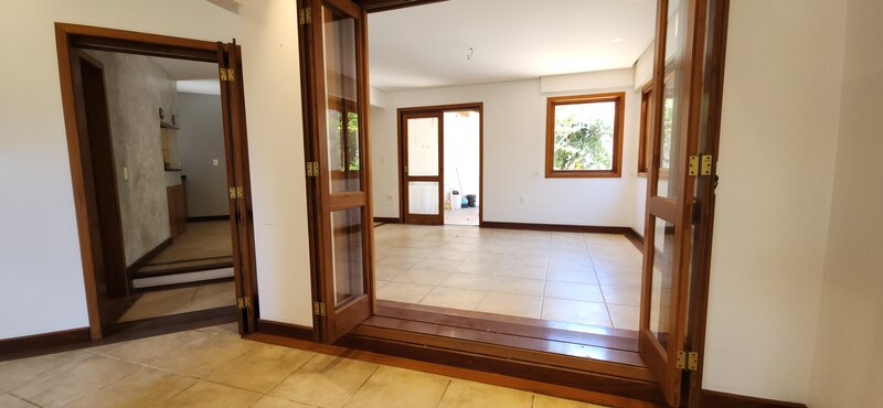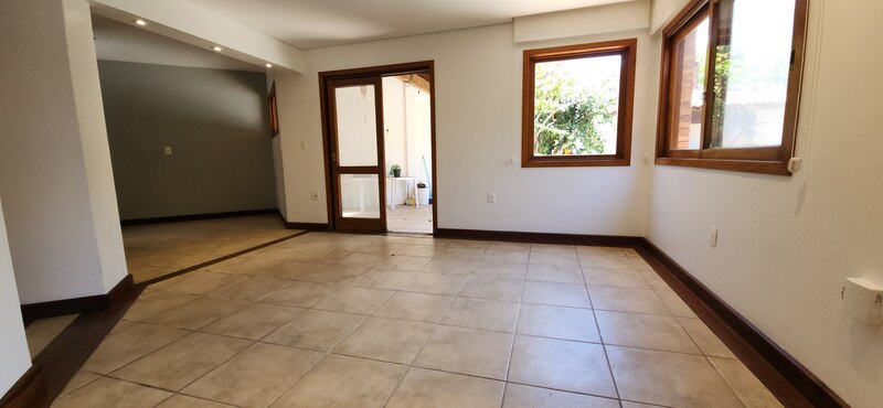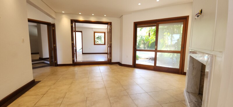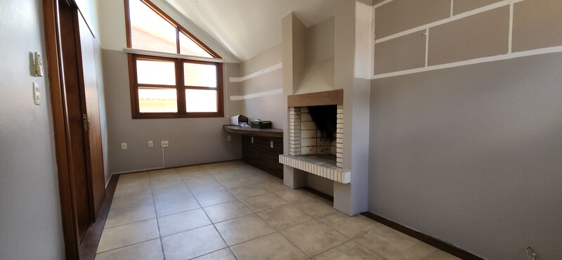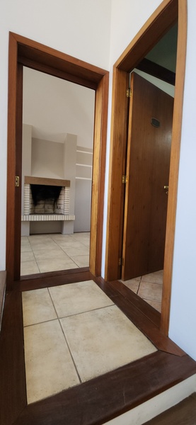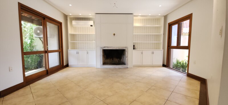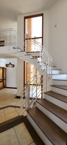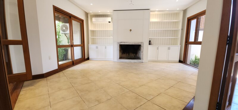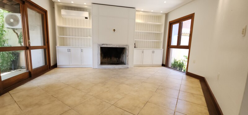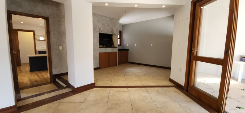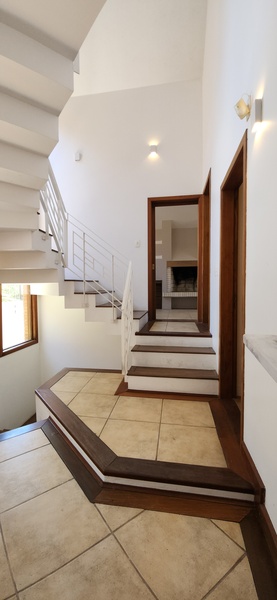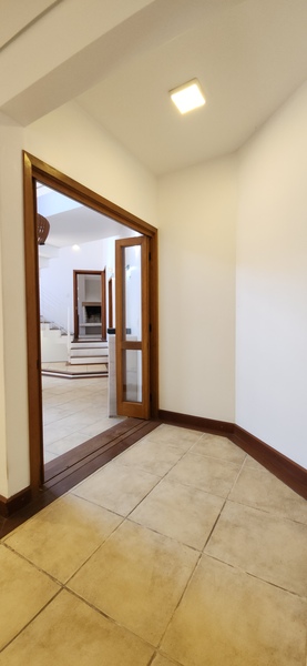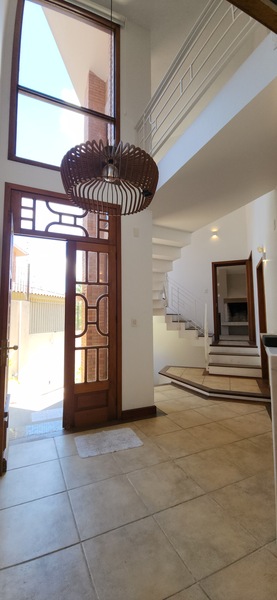 Ao entrarmos no sobrado, podemos notar um hall de entrada e pela direita uma aconchegante sala de estar com lareira; Um degrau nos leva para um lindo ambiente de integração composto por uma sala de jantar + espaço gourmet com churrasqueira. Desse ambiente, é só escorrer as portas janelas que elas abrem para o espaçoso pátio com piscina, quiosque e churrasqueira.