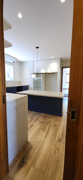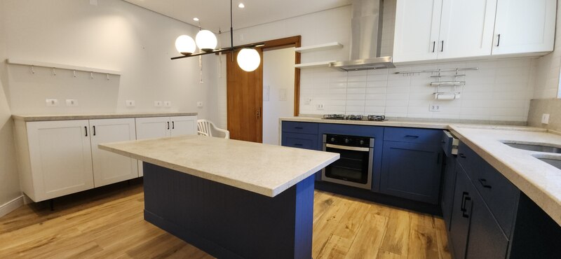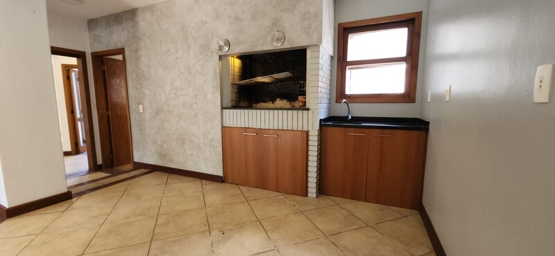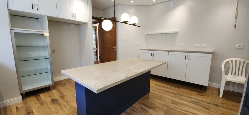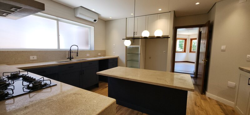 Voltando ao espaço gourmet podemos notar uma abertura que nos leva à cozinha, ela é climatizada e toda planejada com móveis de excelente qualidade; Pela cozinha podemos acessar a despensa e a área de serviço;