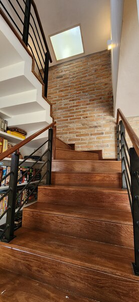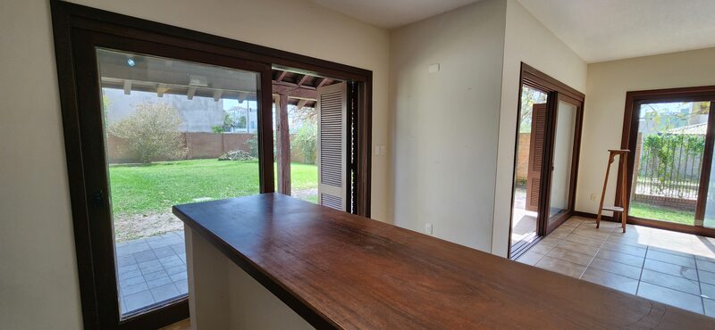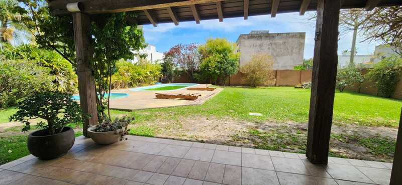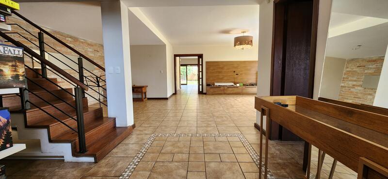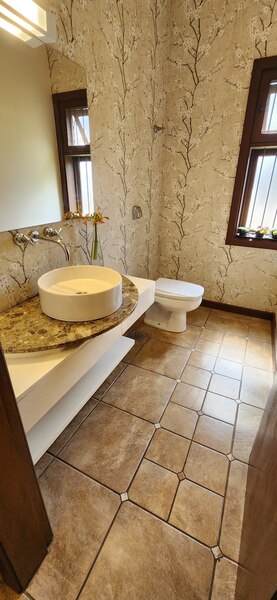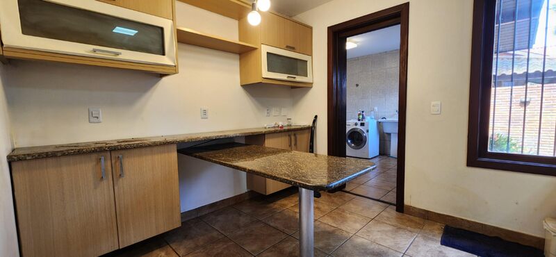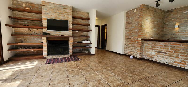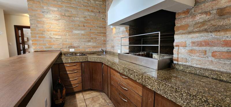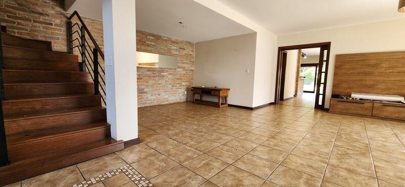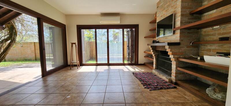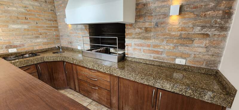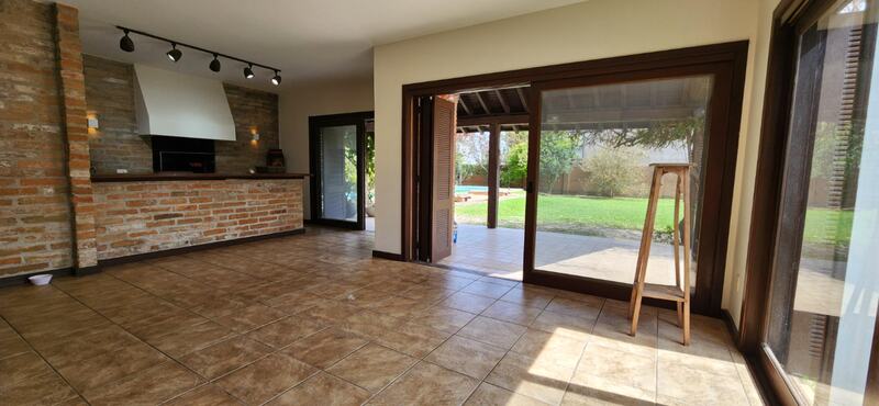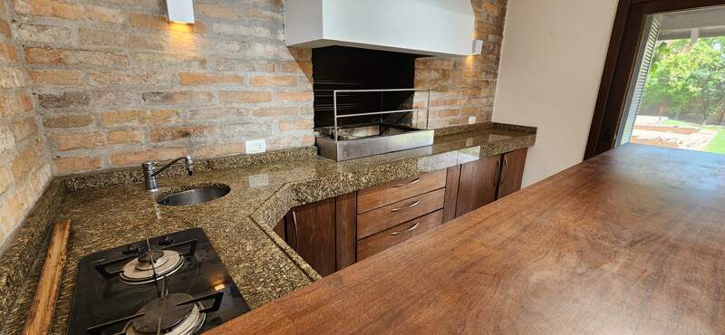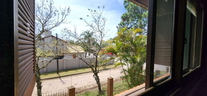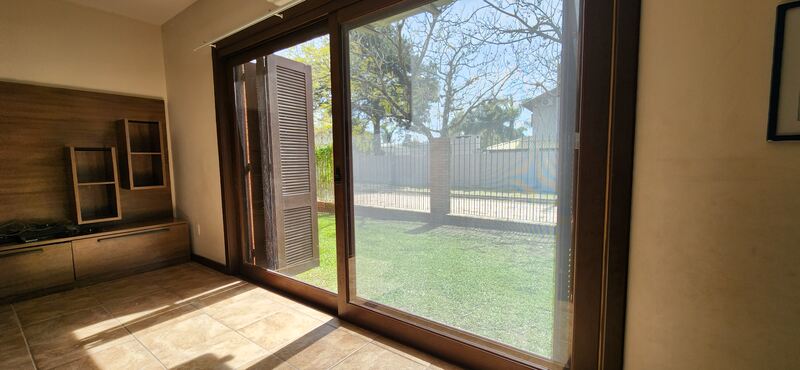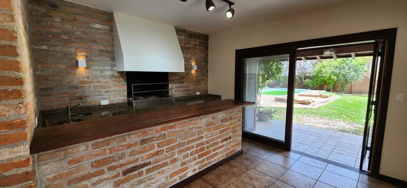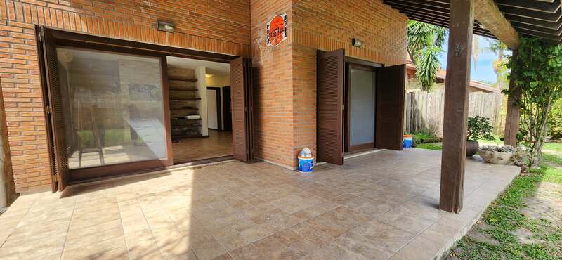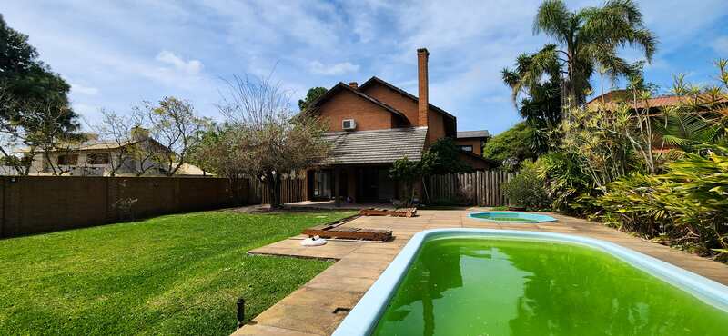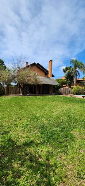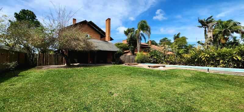 Ao entrarmos, podemos notar no andar térreo, um hall de entrada que nos leva à sala 2 ambientes sendo a parte estar e jantar bem definidas; na parte estar, temos porta janela que abre para o pátio; ao lado, um lavabo; pela sala, podemos também acessar a copa/cozinha sendo que esta dá acesso à àrea de serviço e dependência completa do imóvel; temos também uma aconchegante sala íntima com lareira de alvenaria para os dias frios de inverno; pela sala íntima, podemos ver uma bancada em madeira com churrasqueira, que compõe o espaço gourmet do imóvel, excelente área de convivência para reunião entre amigos e familiares; desse ambiente, também conseguimos ter acesso ao pátio; ele comunica ao espaço onde está localizada a piscina; o pátio é todo gramado e super amplo; entre o pátio e ao ambiente gourmet, temos uma varanda coberta, ótima para os dias de verão;