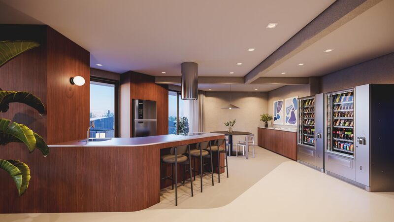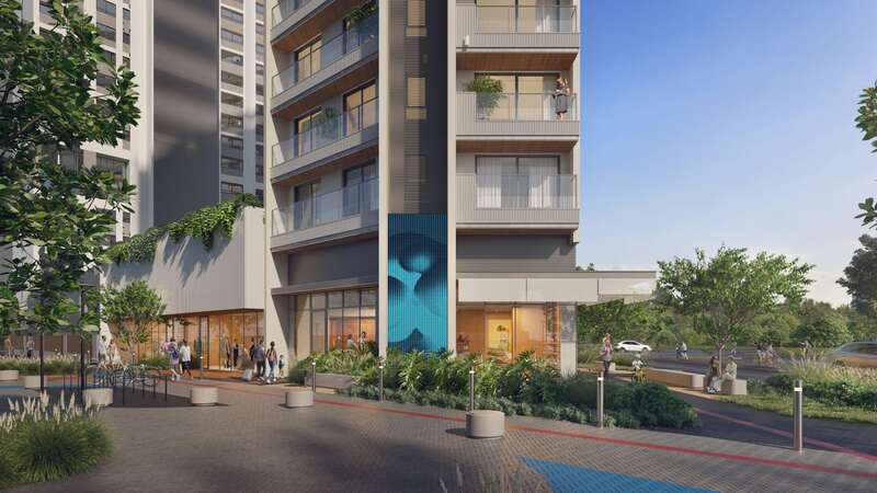 Edifício com hall de entrada térreo com portaria virtual e controle de acesso por reconhecimento facial e senha e armário inteligente, com acesso à partir da Alameda das Artes. Bicicletário junto ao estacionamento coberto do segundo pavimento e terceiro pavimento com Living condominial, contendo espaço multiuso para reuniões e área gourmet integrada, com sacadas de frente ao Paque Una e Alameda das Artes, além de elevador, lavanderia e banheiro condominial.