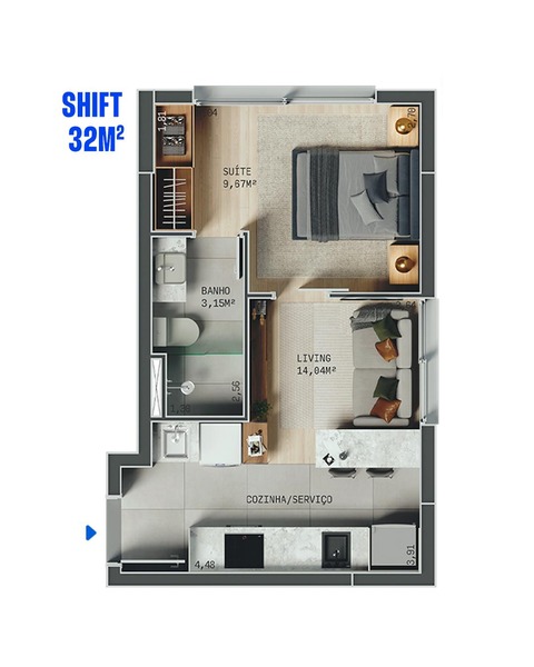 O imóvel possui 32m² distribuídos em sala de estar, cozinha com churrasqueira, 1 dormitório sendo suíte e sacada com vista para o Parque Una.