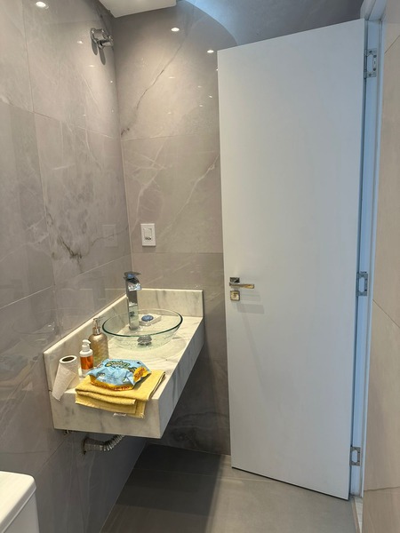 Retornando para o andar térreo, ao final da escadaria, pela direita acessamos o lavabo que atende a área social;
