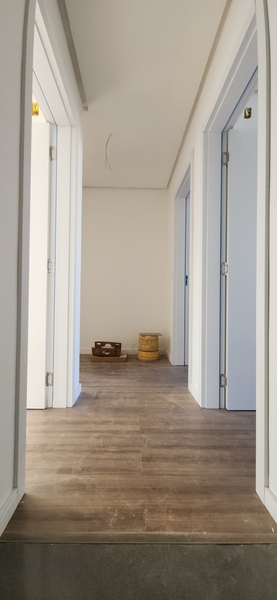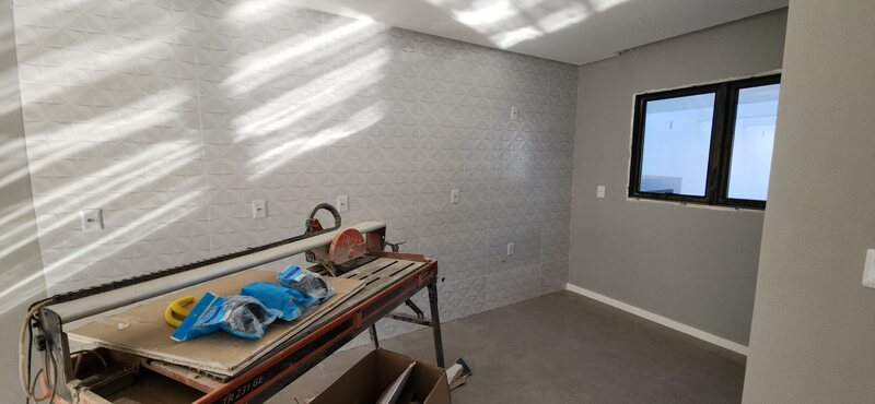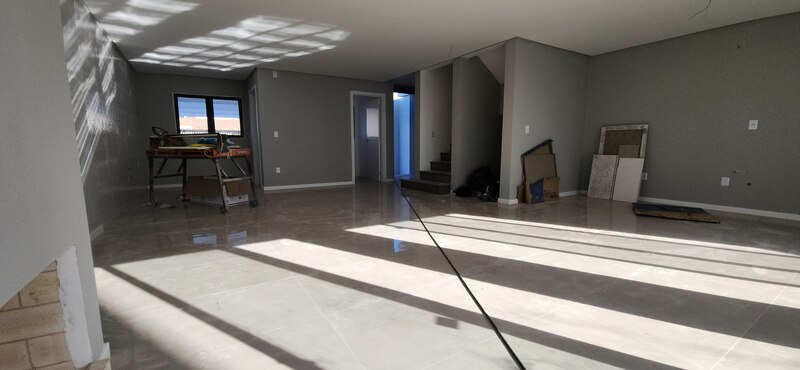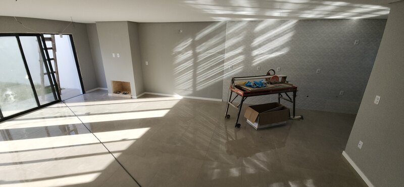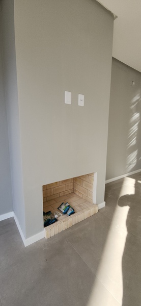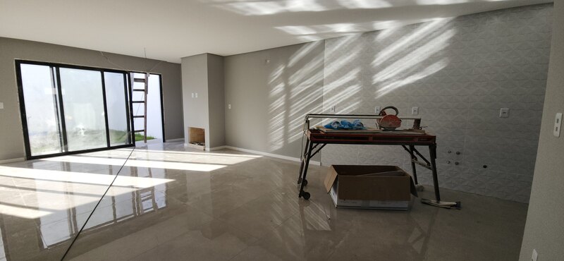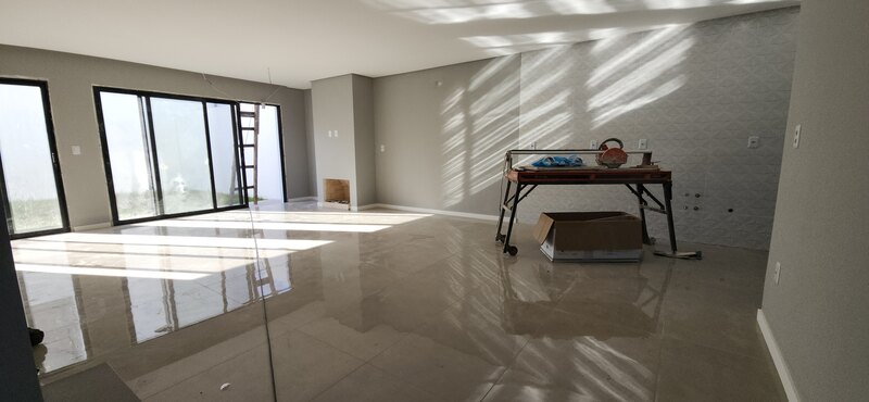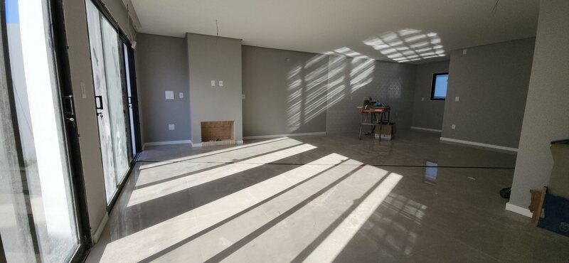 No pavimento térreo, o sobrado conta com uma ampla sala de estar e jantar com lareira, cozinha integrada, lavabo e área de serviço; No andar superior está a área íntima, composta por dois dormitórios, um banheiro social completo e uma suíte com banheiro completo.