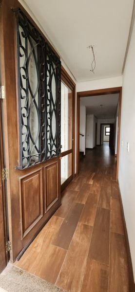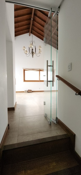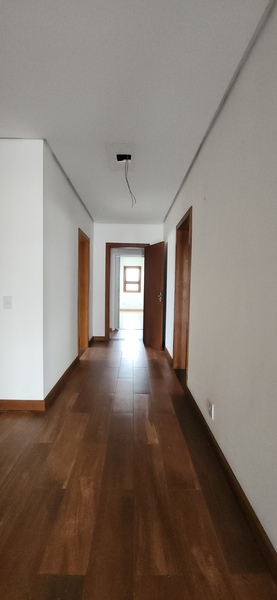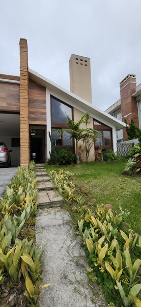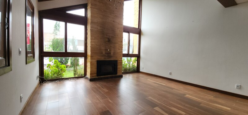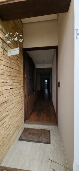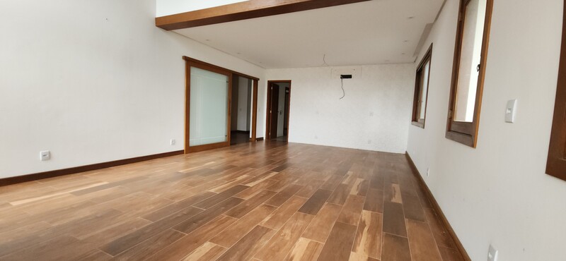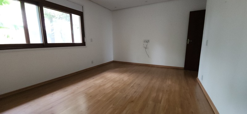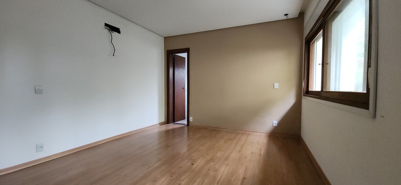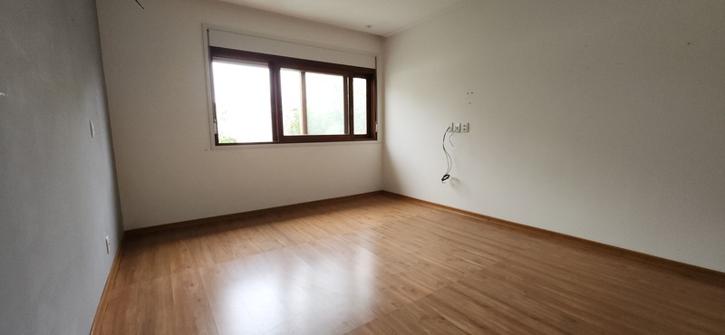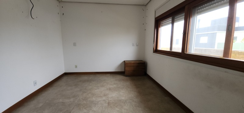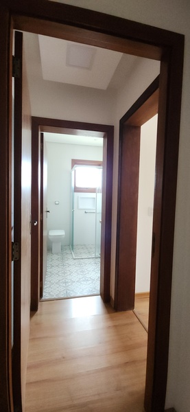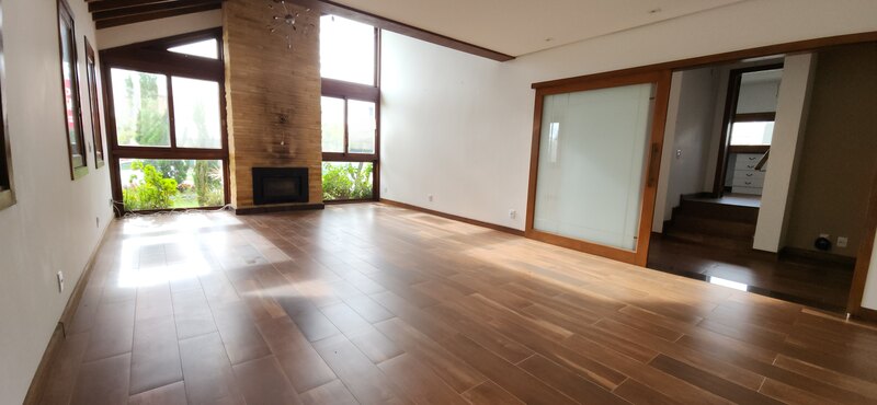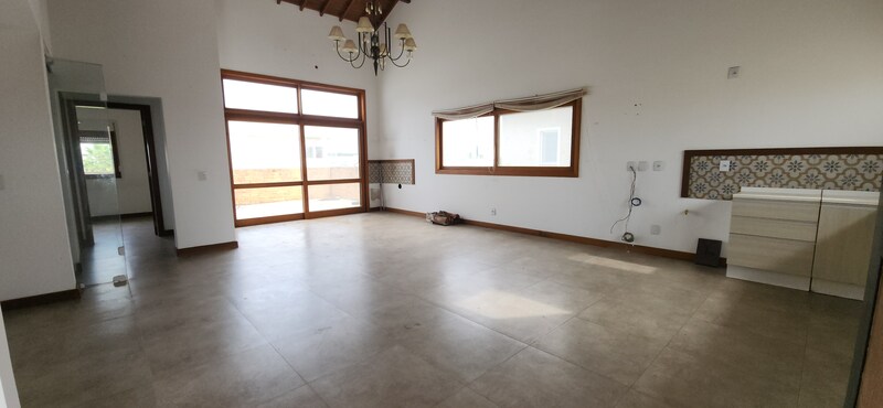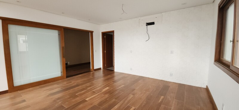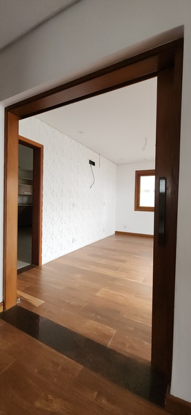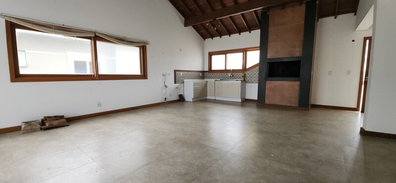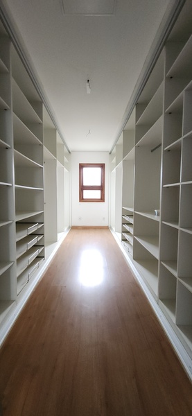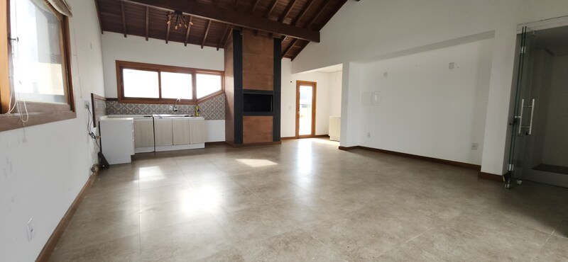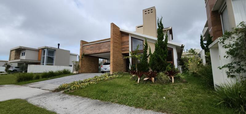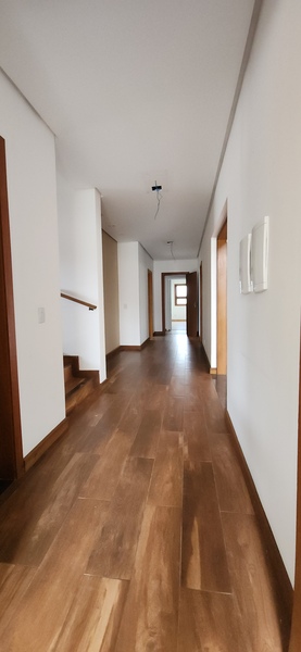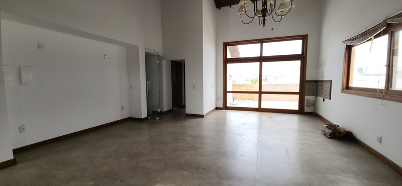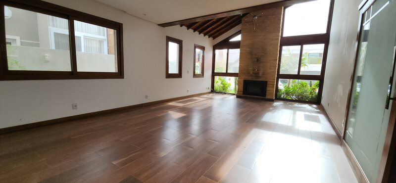 A residência possui 303 m² de área privativa, logo na entrada, há um lavabo que atende a área social. A sala principal é ampla, com dois ambientes integrados e lareira, proporcionando um espaço aconchegante. Um corredor conduz à área íntima, onde estão localizados dois dormitórios térreo, ambos são suítes com banheiros completos e têm acesso direto a um closet espaçoso, planejado para atender os dois dormitórios de forma prática e organizada.