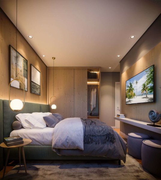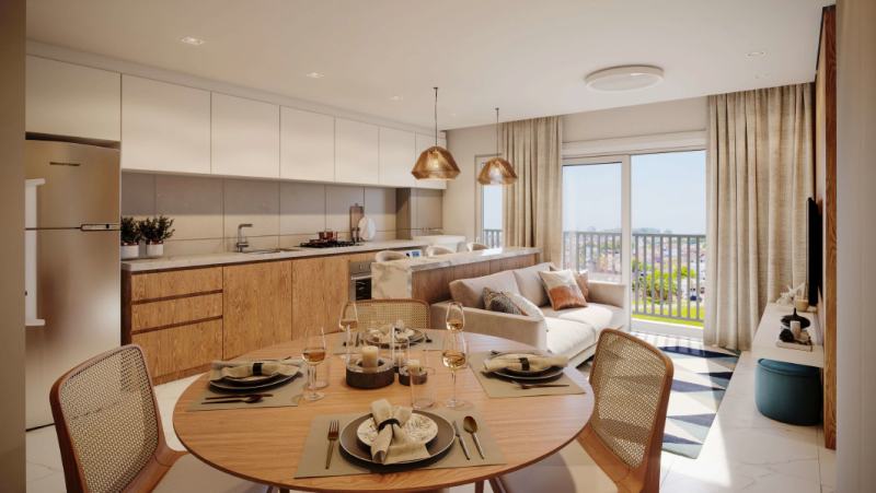 Localizado no 5° andar, são 70m² de área privativa, possui uma sala 2 ambientes, cozinha integrada, sacada com churrasqueira, área de serviço, banheiro social, 3 dormitórios sendo 1 suíte.